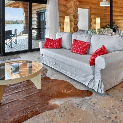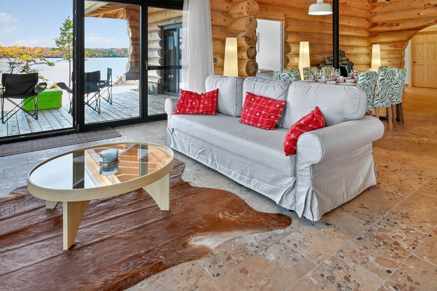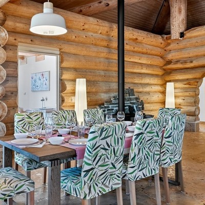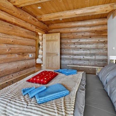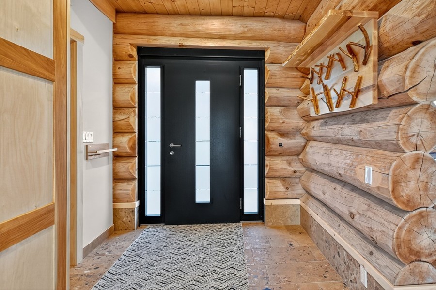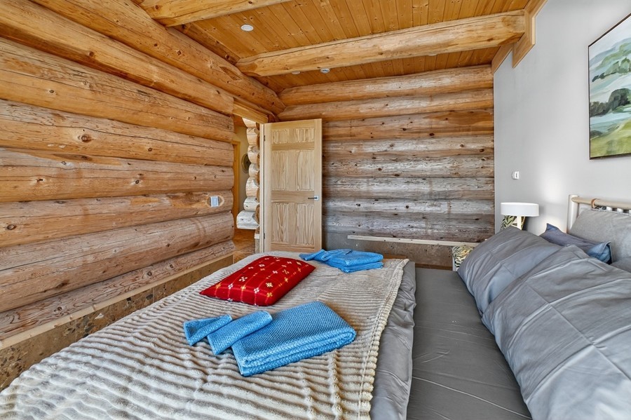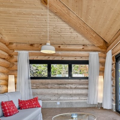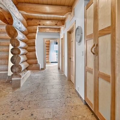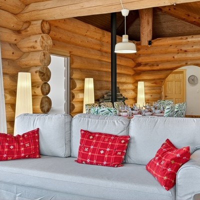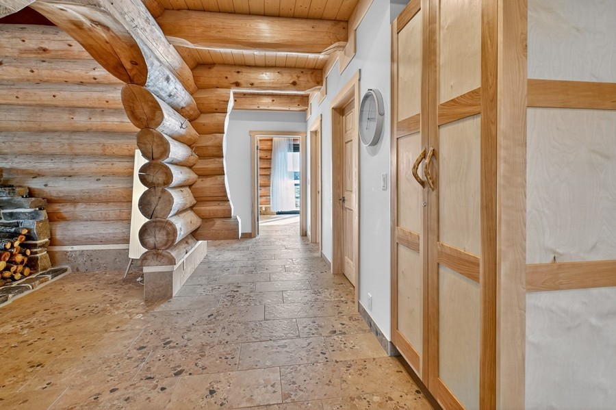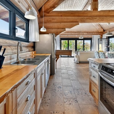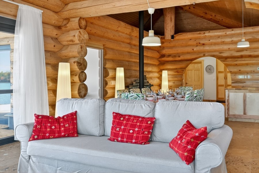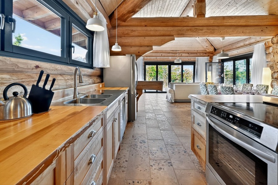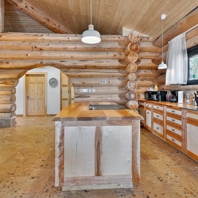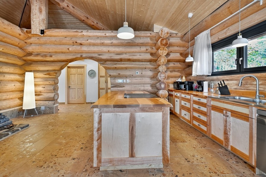 Das große Wohn‑Esszimmer mit integrierter Küche bildet das warme Zentrum des Hauses. Die mächtigen Zedernstämme, bis zu 60 cm im Durchmesser, verleihen dem Raum eine beeindruckende, fast majestätische Präsenz.
