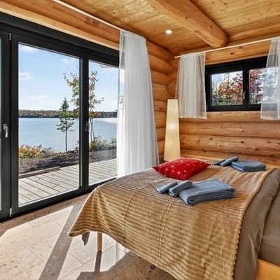 An der äußersten Spitze der Halbinsel, dort wo der Blick über das Wasser ungestört bis zum Horizont schweifen kann, steht unser 160 m² großes Naturstamm-Musterhaus.